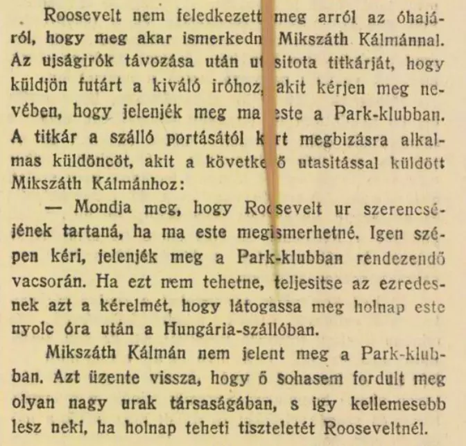 Mikszáth Kálmán nem jelent meg a Park-klubban. Azt üzente vissza, hogy ő sosem fordult meg olyan „nagy urak társaságában”, így kellemesebb lesz neki, ha ő teheti tiszteletét Rooseveltnél.
