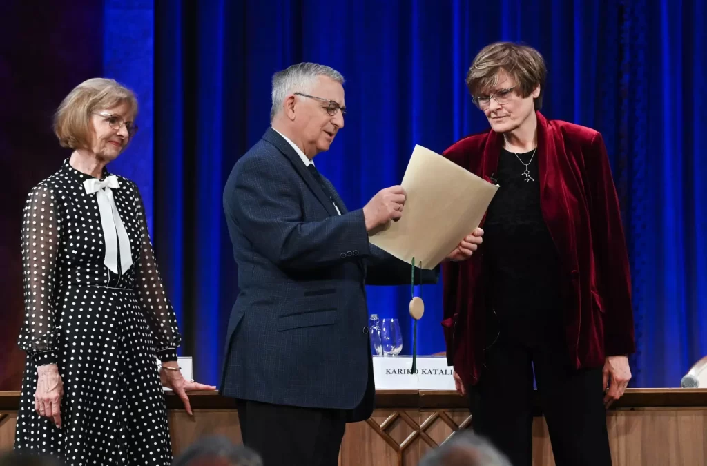 Az ünnepi esemény zárásaként Karikó Katalin átvette Lénárd Lászlótól az MTA tiszteleti tagságát igazoló oklevelet.