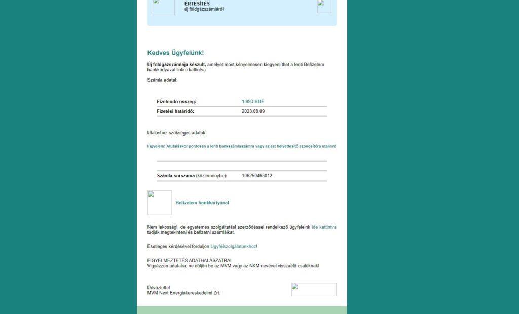 Az MVM Next Energiakereskedelmi Zrt. ügyfelei az utóbbi időszakban ismét adathalász csalók által küldött hamis online földgázszámla-értesítőket kaptak.