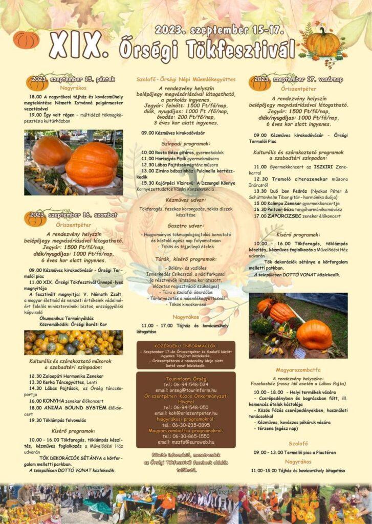 Szalafőn az Őrségi Népi Műemlékegyüttes területén szombaton egész nap gyermekműsorokkal, néptánc foglalkozásokkal, bábelőadásokkal várják a családokat, de a kézműves udvarban idén is lehetőség nyílik töklámpásfaragásra és fazekas korongozásra. A gasztro udvarban bemutatják a hagyományos tökmagsajtolást, valamint egész nap tökös és tájjellegű ételeket lehet kóstolni.